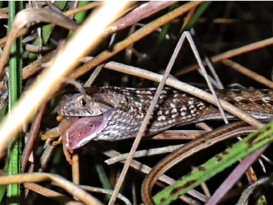 No mide más de 80 cmts. de largo, se alimenta de sapos, ranas, peces, roedores y lagartijas.