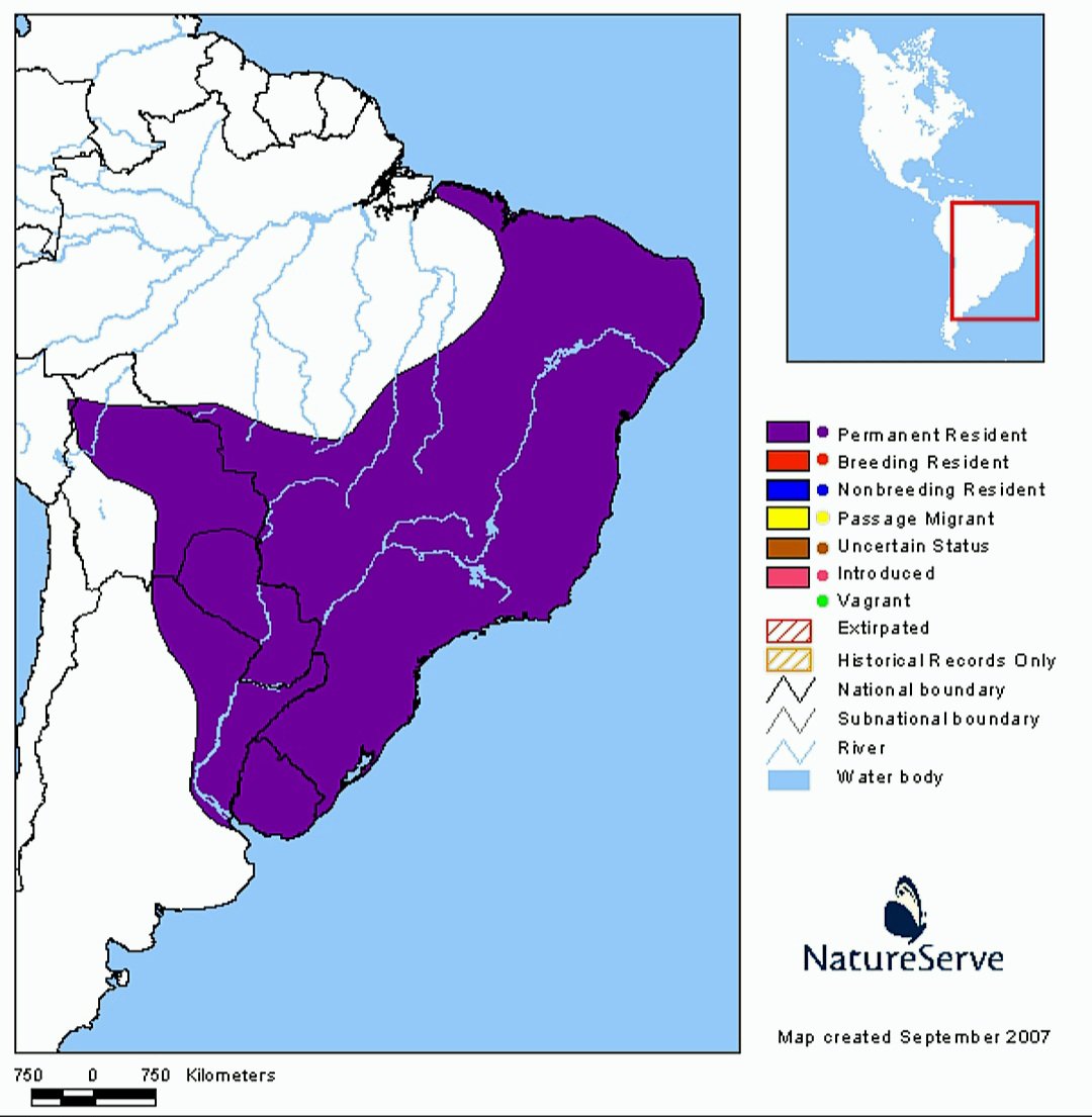 Ave que se puede encontrar en casi todo el país, siendo rara en el Suroeste; es monotípica en su género.