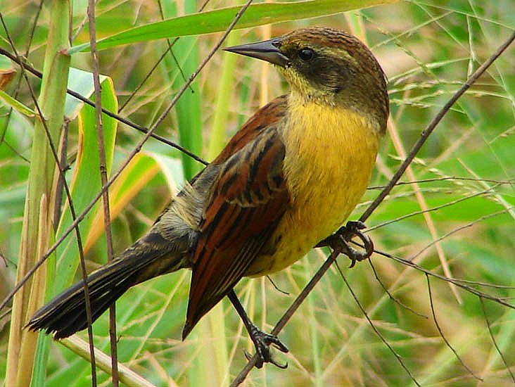 El macho es similar a tordos y mirlos, pero la hembra es distintiva.