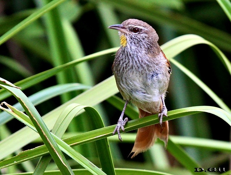 Se alimenta principalmente de pequeños artrópodos, que caza entre las ramas de arbustos y en hojas de grandes gramíneas y ciperáceas.